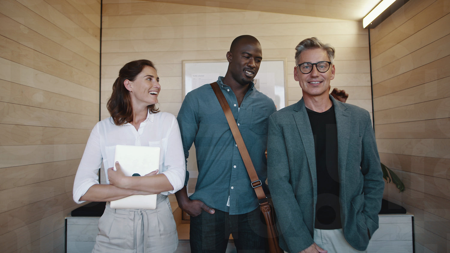 Multi-ethnic group of creative professionals standing together in an office. Successful business team looking at camera and smiling.