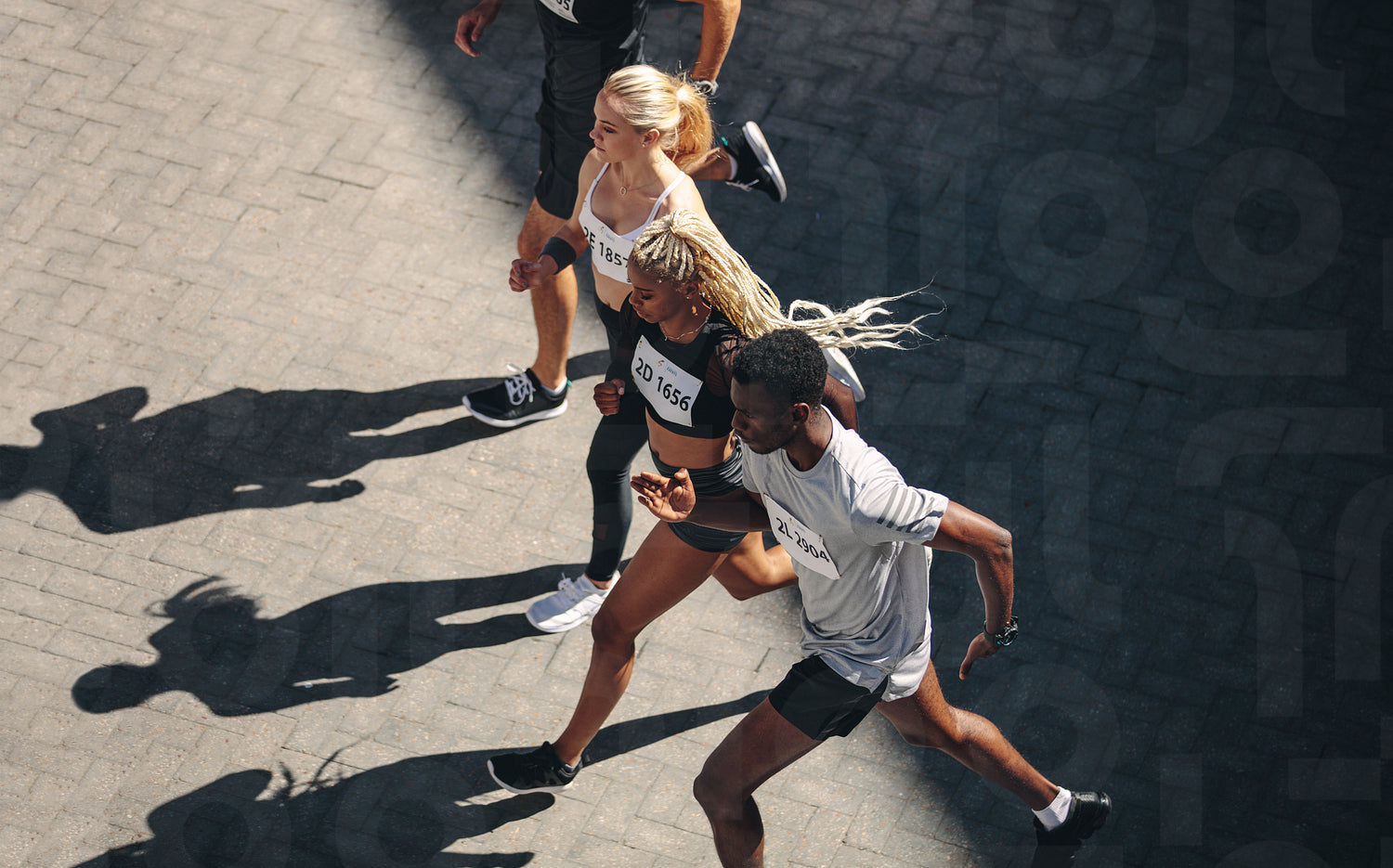 Multi-ethnic group of people running together. Top view of running club members exercising together in the city.