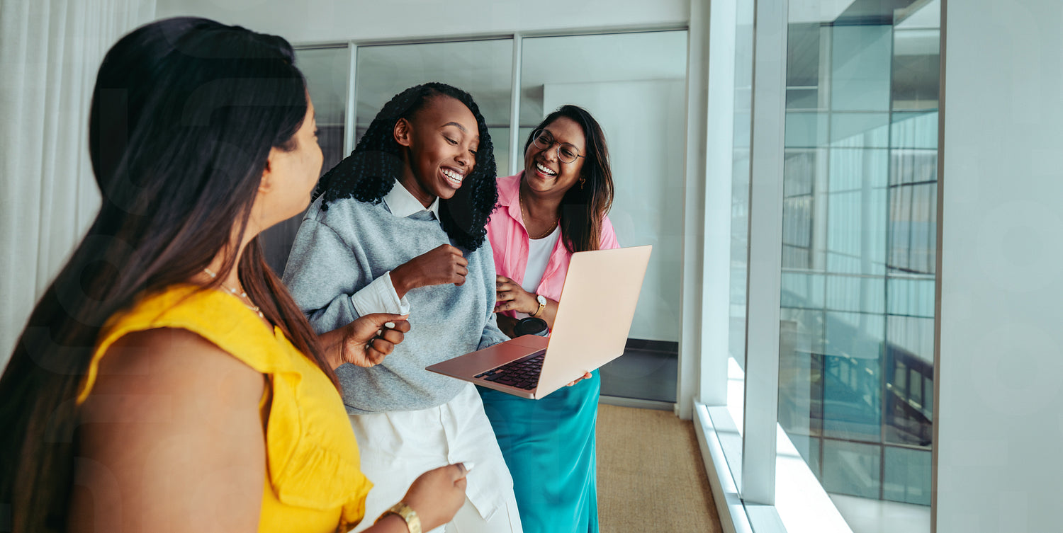 Multicultural team of joyful coworkers sharing a laugh over a laptop in a bright office setting