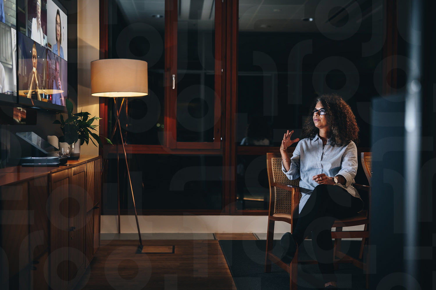 Businesswoman leading a confrence call with team late night. Multiracial business people having a video call.