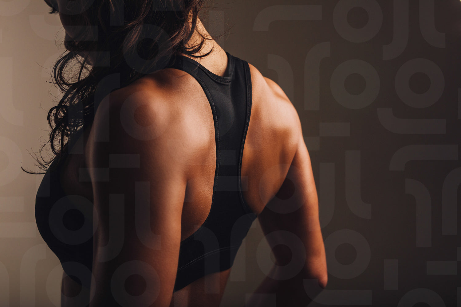 Rear view of strong young woman wearing sports bra. Muscular back of a woman in sportswear.