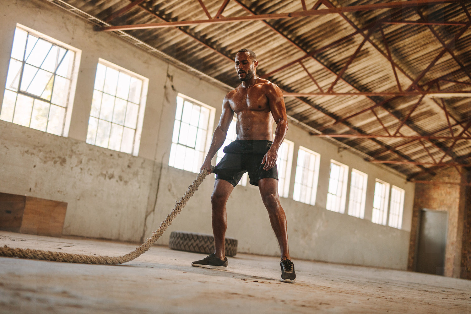 Fit man exercising with battling ropes inside old factory. Muscular man working out in cross training gym.