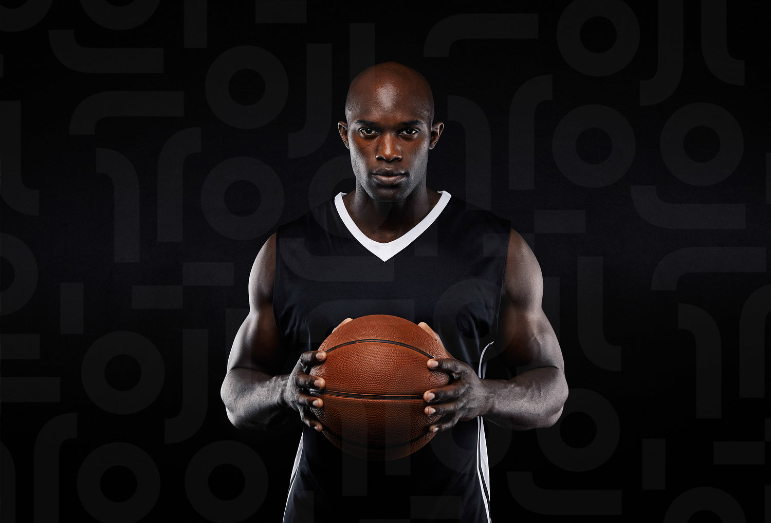 Portrait of muscular young male basketball player in uniform with a basketball posing on black background