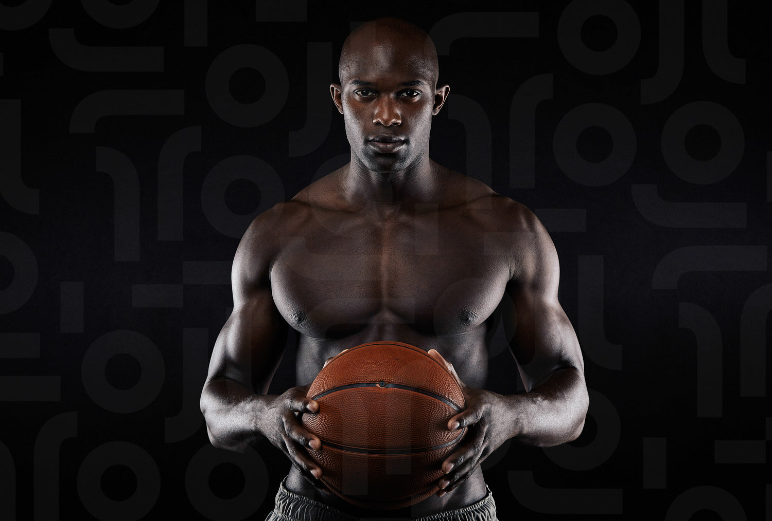 Portrait of muscular young man shirtless holding a basketball. Afro american basketball player against black background.