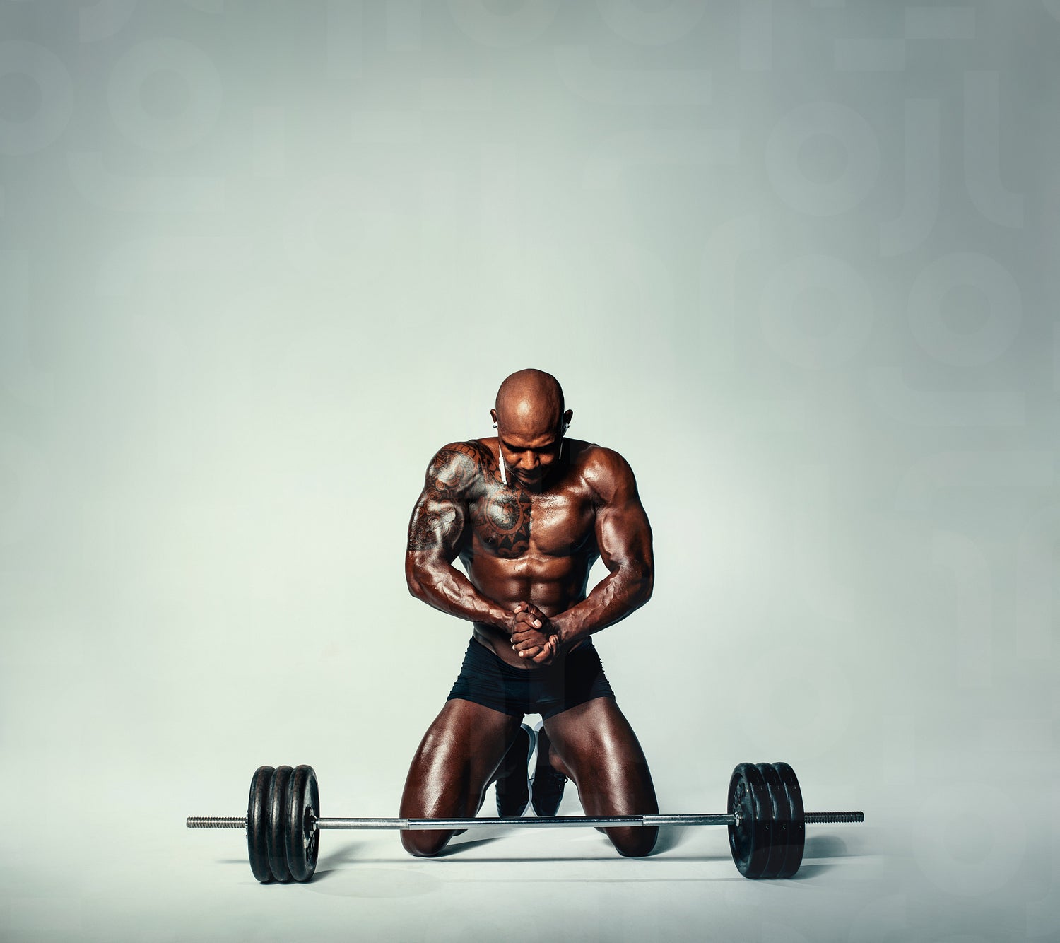 Studio shot of fit african man with barbell. Muscular young man working out with heavy weights over grey background.