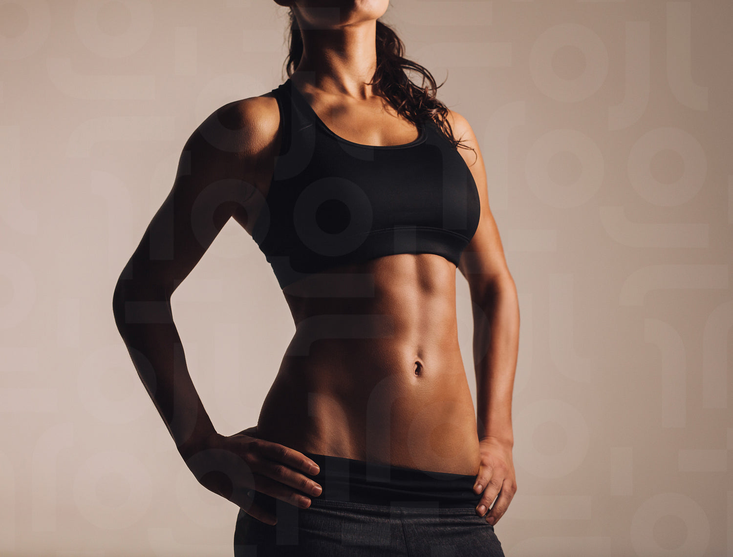 Fitness female model torso with her hands on hips. Female with perfect abdomen muscles.