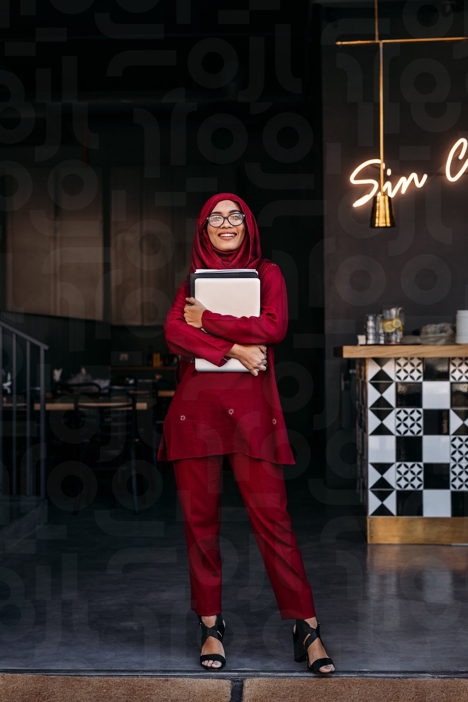 Full length of woman in hijab looking at camera while standing at coffee shop door holding laptop. Muslim business woman standing at restaurant door.