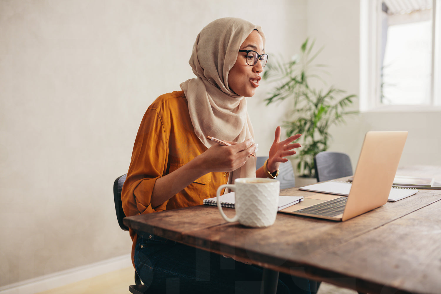 Muslim businesswoman working at home due to pandemic isolation. Female wearing hijab talking over a video call with team.