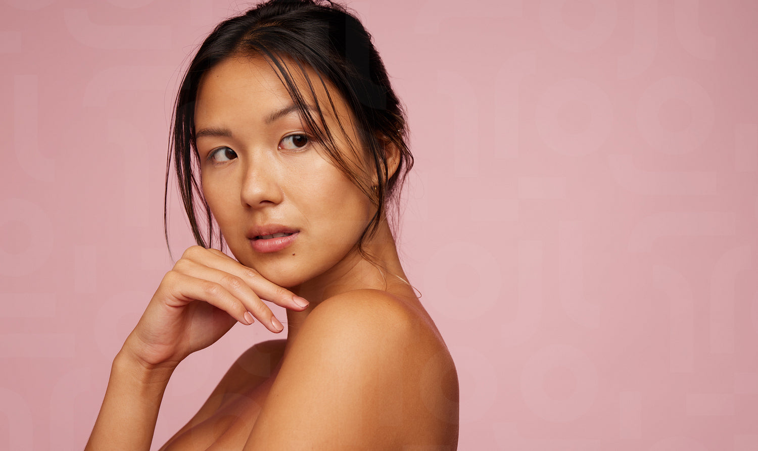 Portrait of a asian female model with healthy skin on pink background. Natural beauty looking away with hand on chin.