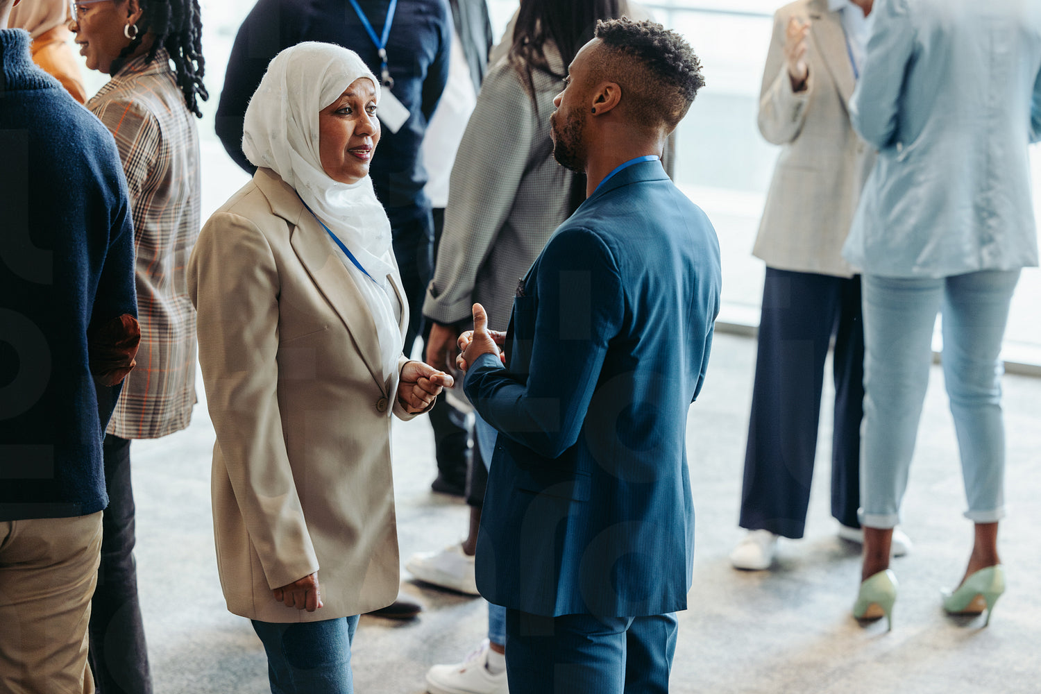 Diverse group of professionals networking and interacting at a business conference event. People are engaged in conversations and building connections.