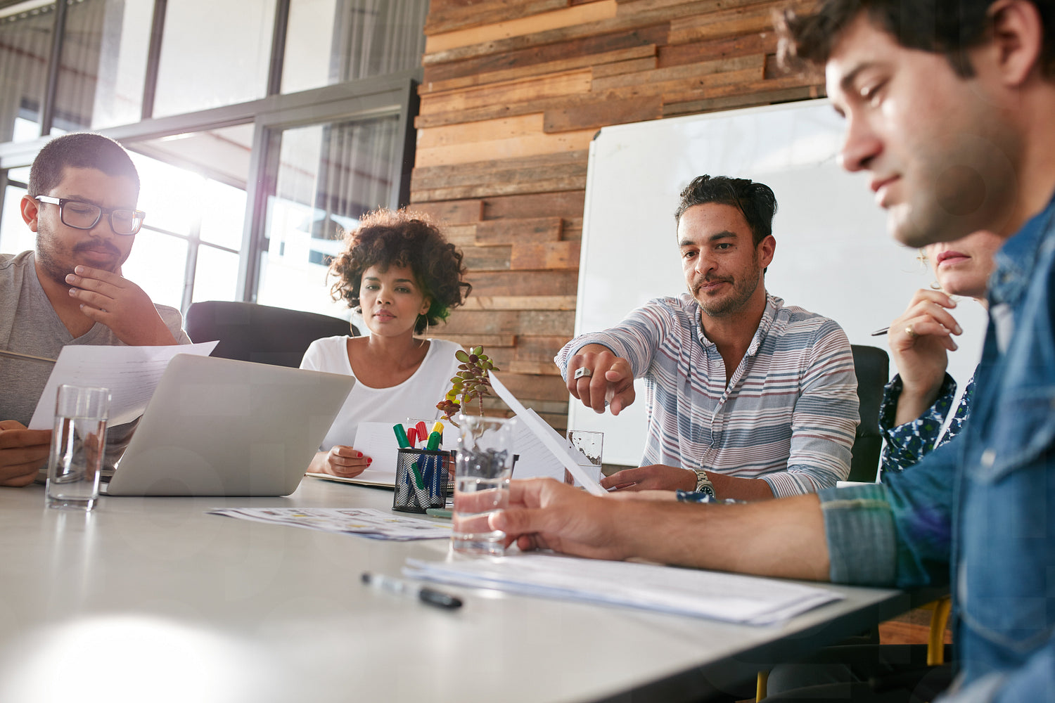 Multiracial group of business people meeting in modern office. Team holding business plan discussing about progress of project.