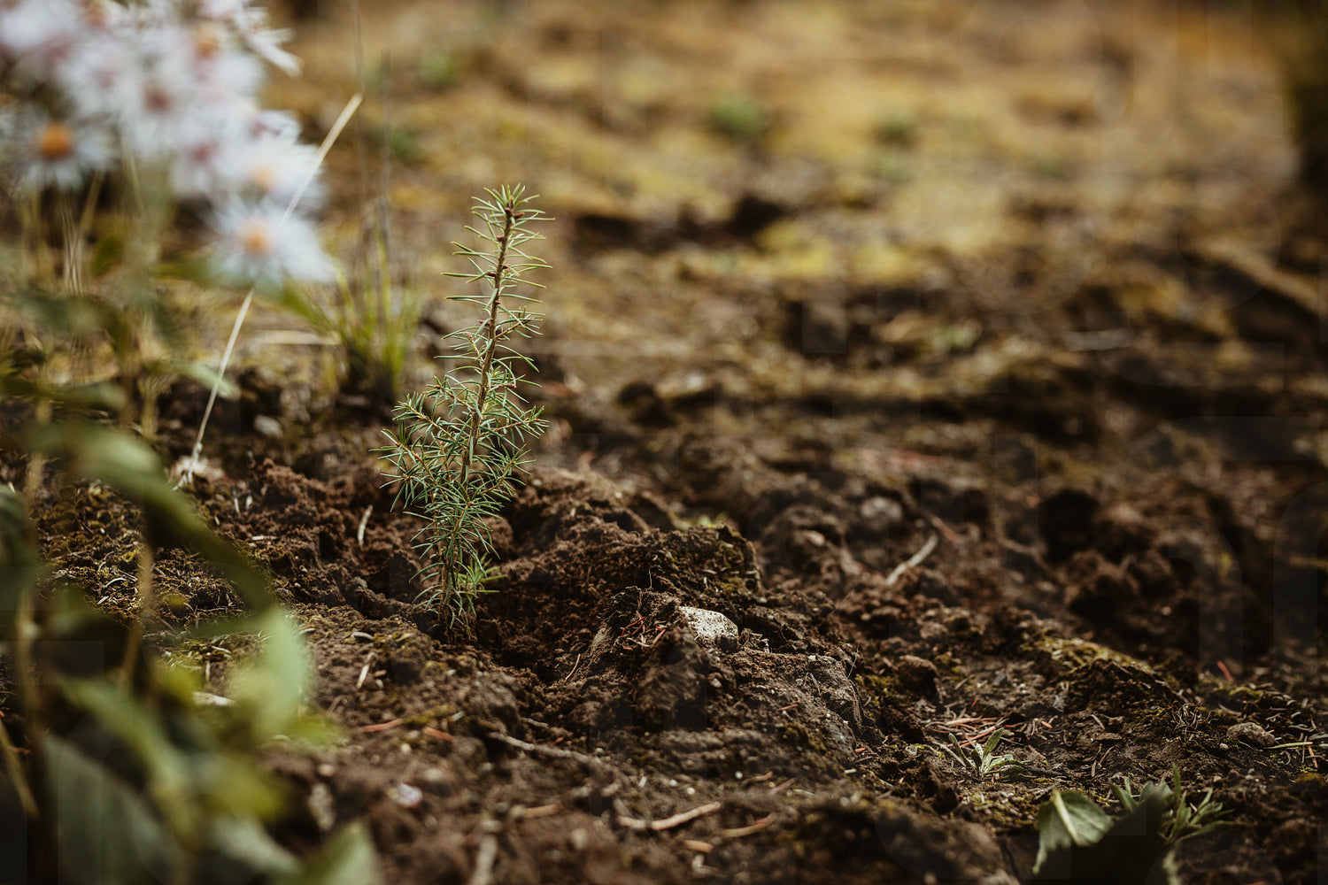 Closeup of a new tree planted in forest. Reforestation after deforestation.