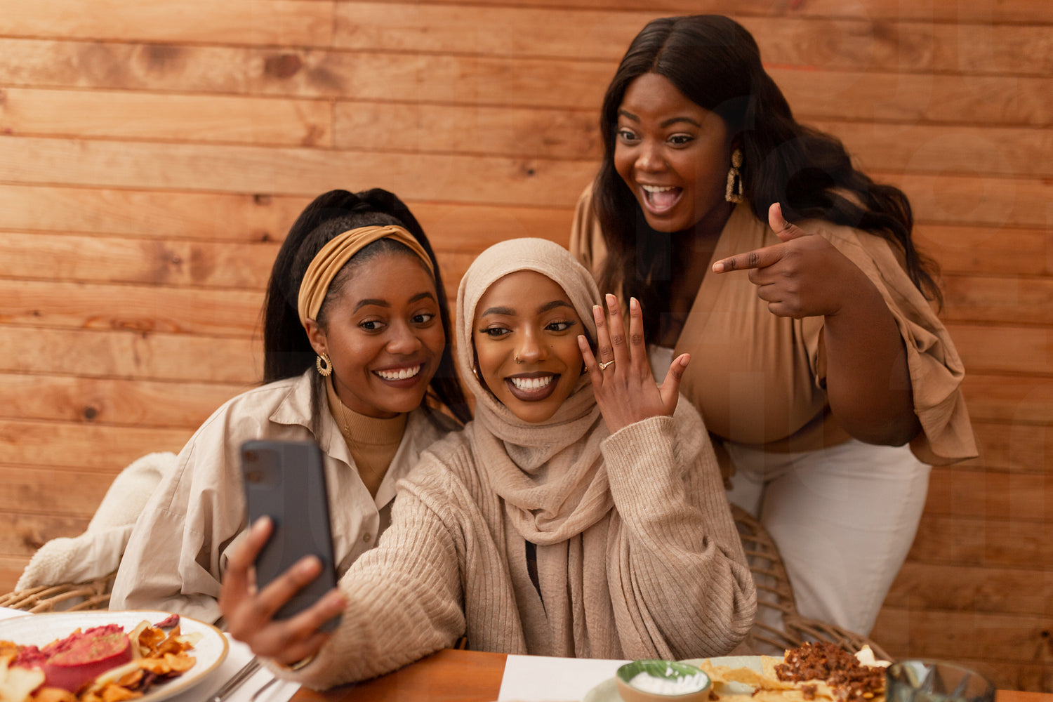 Newly engaged muslim woman showing off her ring on a video call. Group of three multicultural young women celebrating an engagement in a restaurant. Cheerful female friends having lunch together.