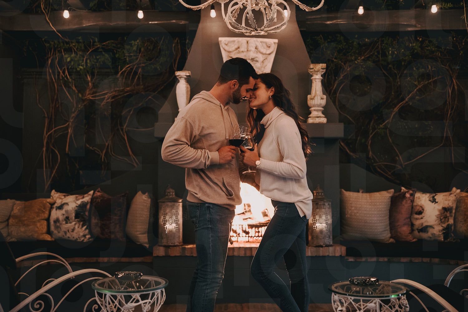 Newly wedded couple kissing while on honeymoon. Two happy young lovers smiling while sharing a romantic moment in a luxury hotel. Affectionate young couple standing together and holding wine glasses.
