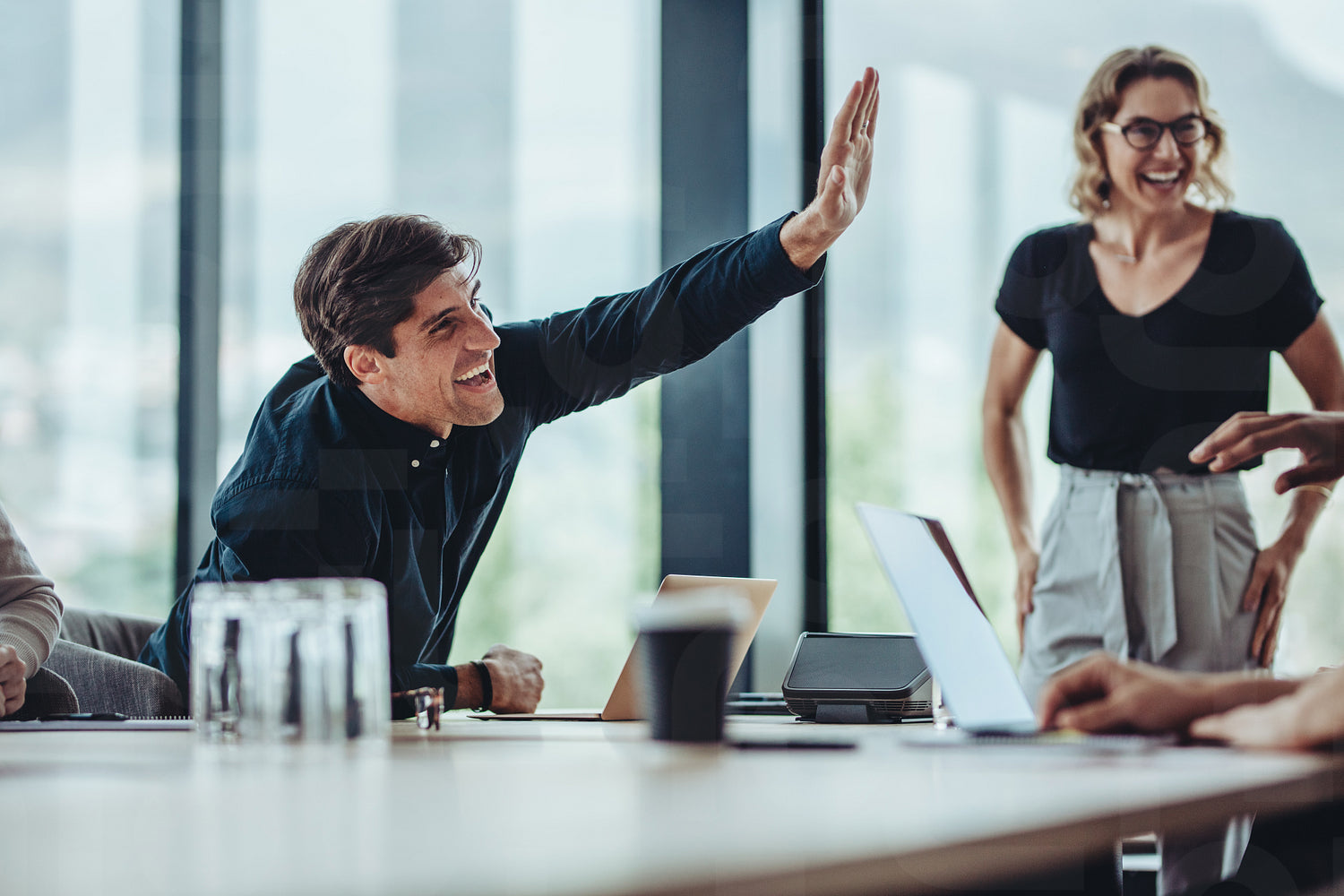 Smiling businessman giving a high five to his coworker sitting around the table in meeting room. Office colleagues sitting in conference room celebrating success.
