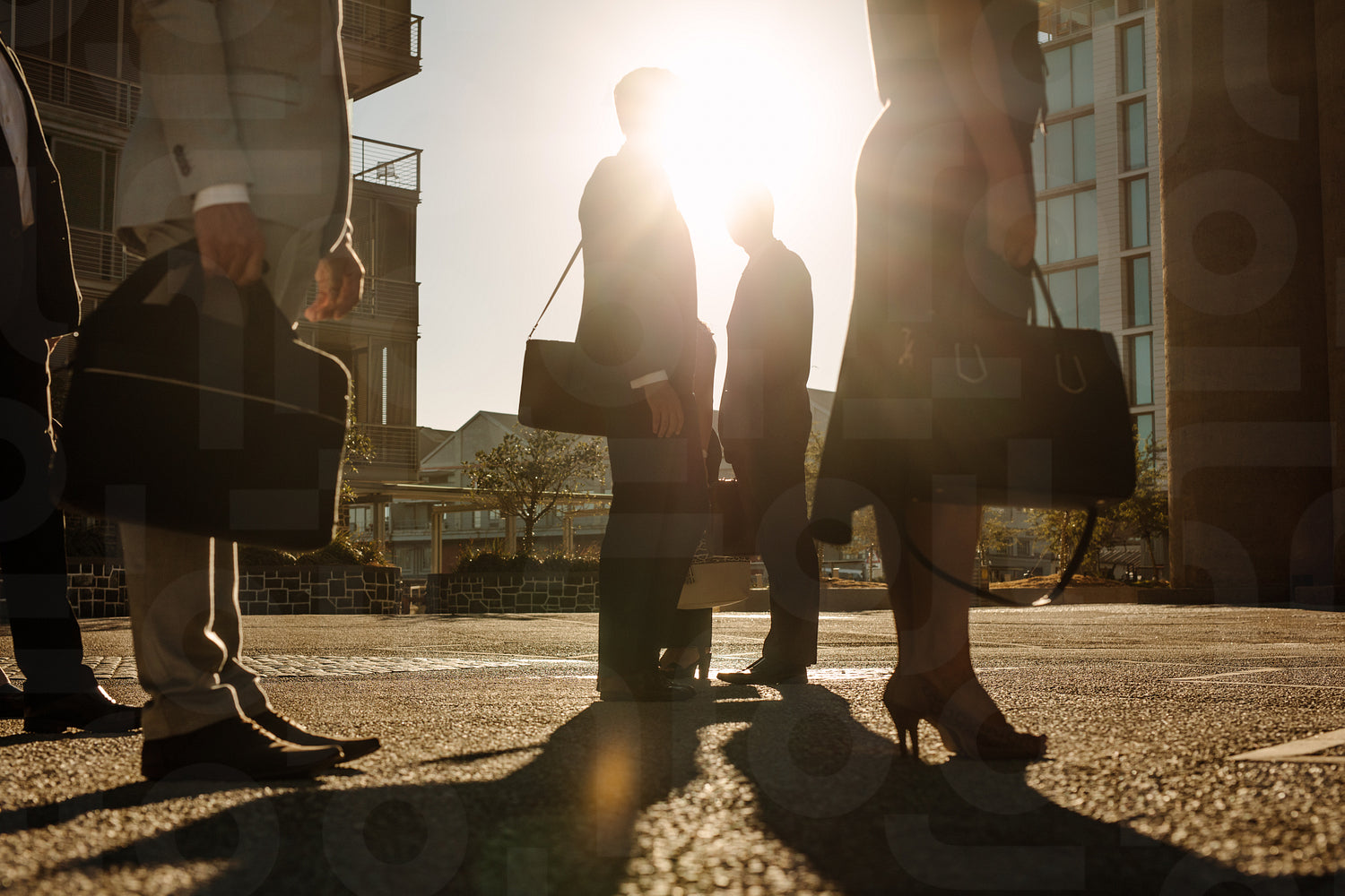Men and woman in formal clothes commuting to office in the morning carrying office bags. Office going people standing on a busy street with sun flare in the background.