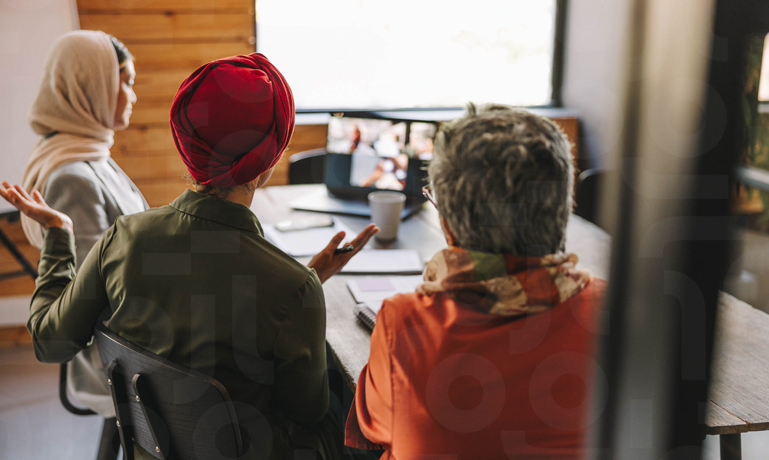 Team of multicultural businesswomen having a discussion with their business partners during an online meeting. Diverse businesswomen attending a video conference in a creative workplace.
