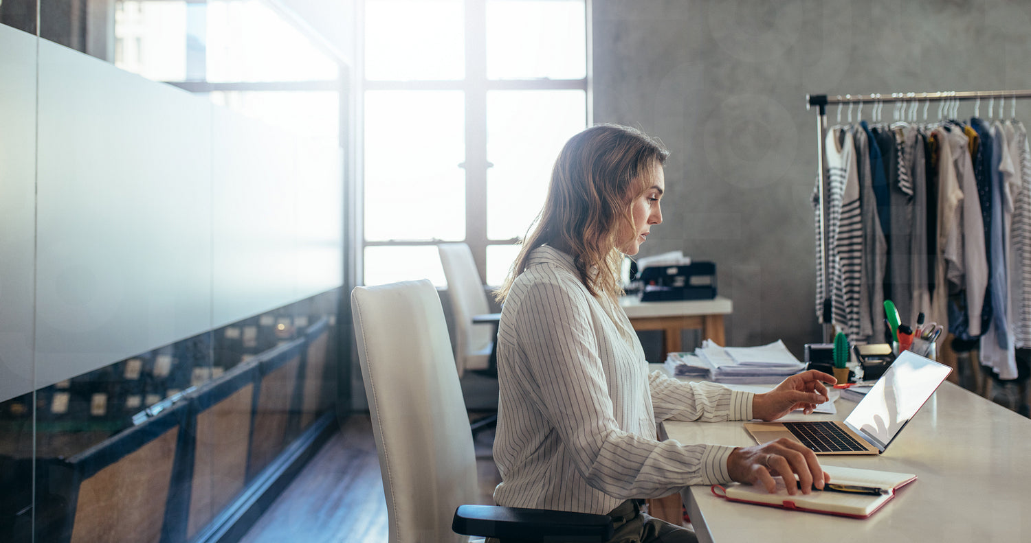 Woman online entrepreneur working on laptop at office. ecommerce business owner working at her desk.
