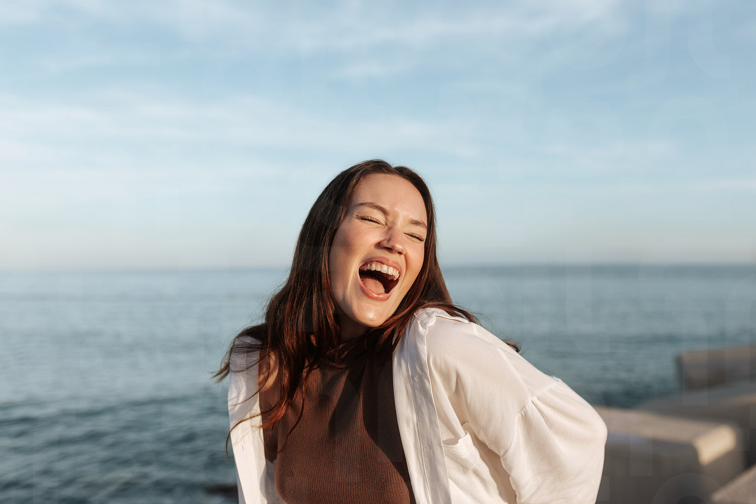Outdoorsy brunette laughing with her eyes closed by the seaside