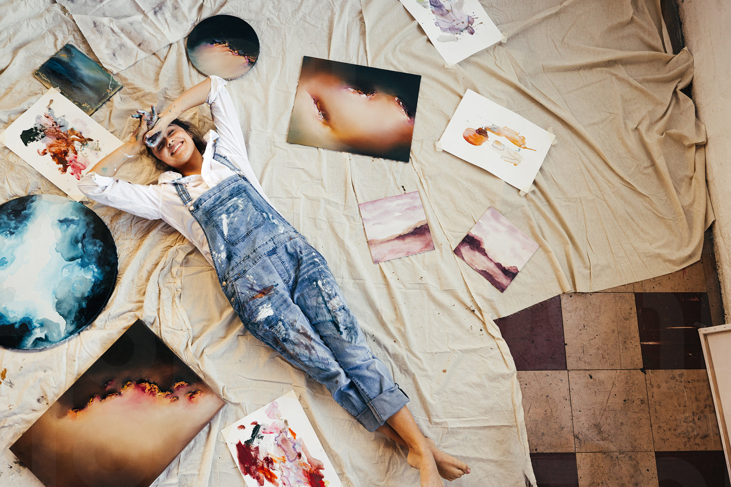 Overhead view of a painter lying in the middle of her paintings. Happy young female artist smiling cheerfully in her art gallery. Creative young woman displaying a portfolio of her artwork.