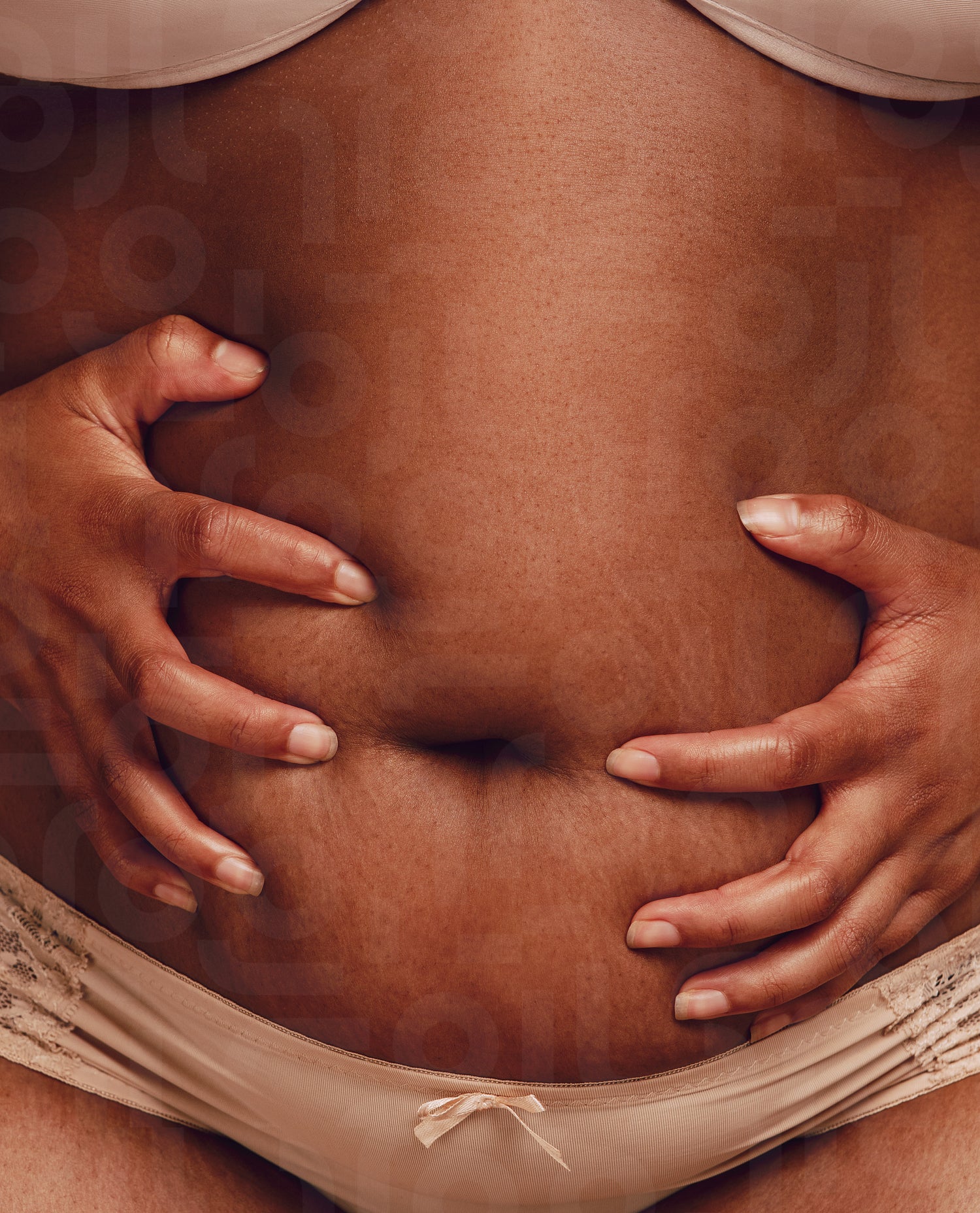Close up of woman pinching fat on her belly. Overweight dark skinned female holding her belly with both hands.