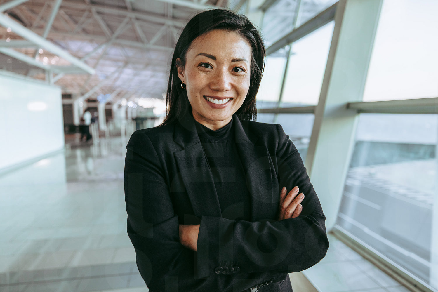 Portrait of smiling businesswoman standing with her arms crossed and looking at camera at airport. Happy female passenger standing in an international airport lounge.