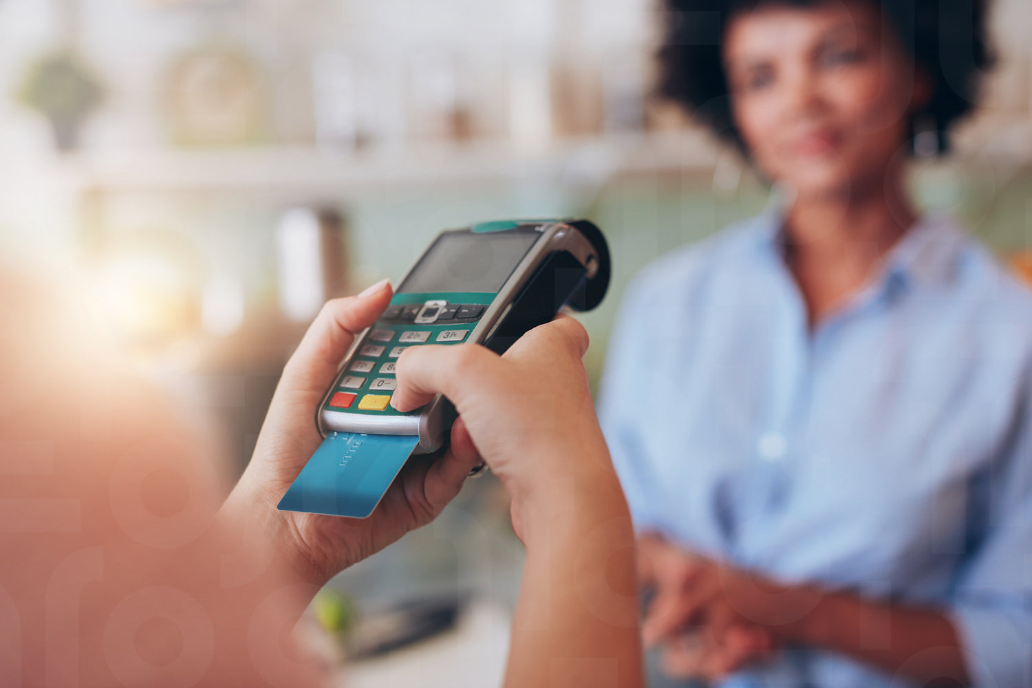 Young woman paying by credit card at juice bar. Focus on woman hands entering security pin in credit card reader.