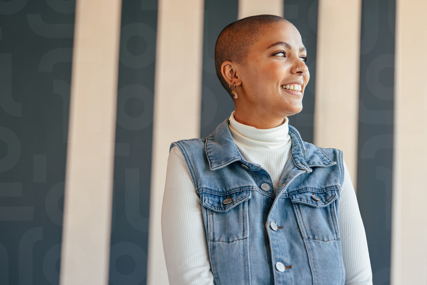 Pensive young businesswoman looking away with a smile on her face. Happy millennial businesswoman thinking of exciting business ideas while standing against a wall in a modern workplace.