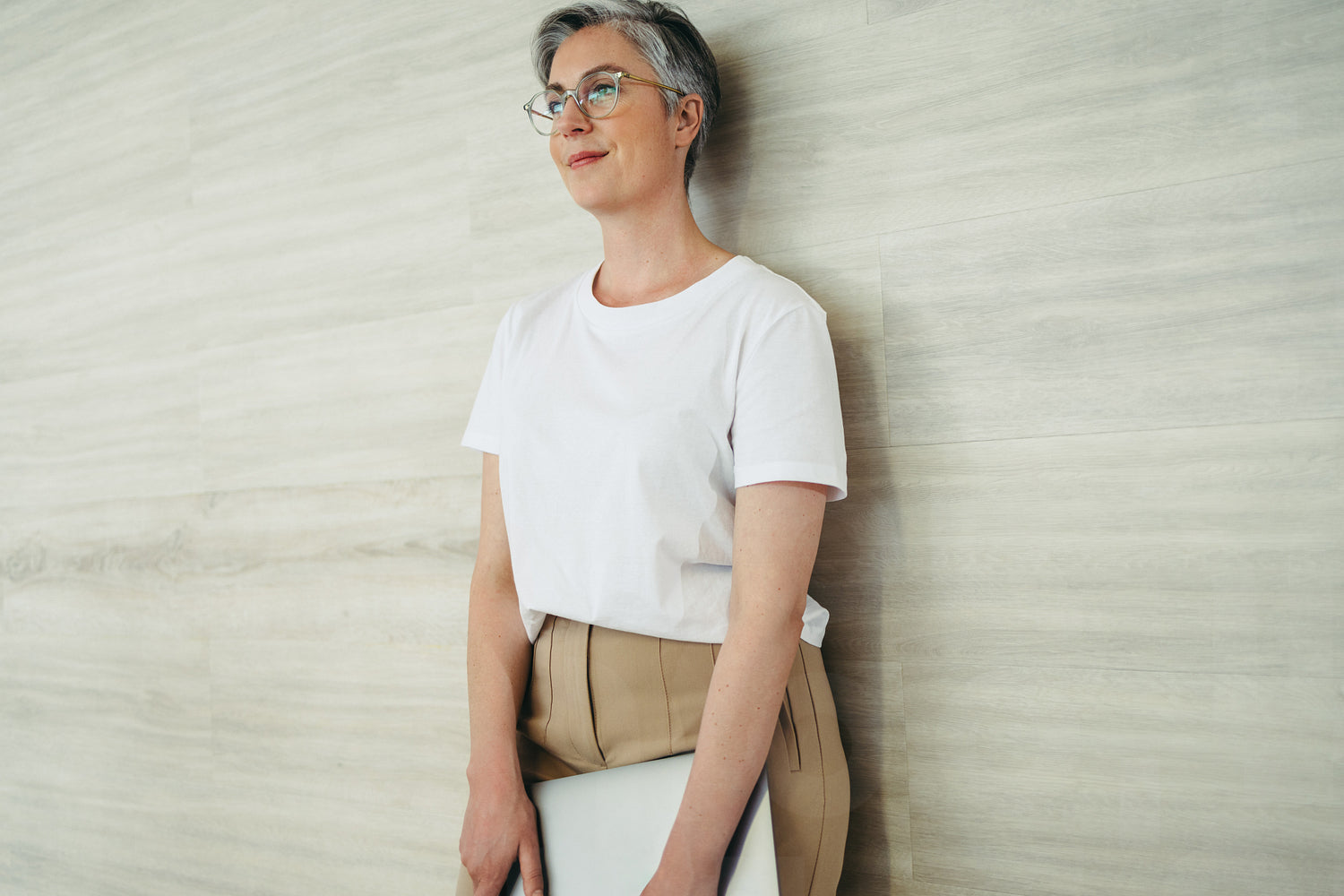 Pensive businesswoman looking away while leaning against a wall in an office. Mature female entrepreneur holding a laptop while standing in a modern workplace.