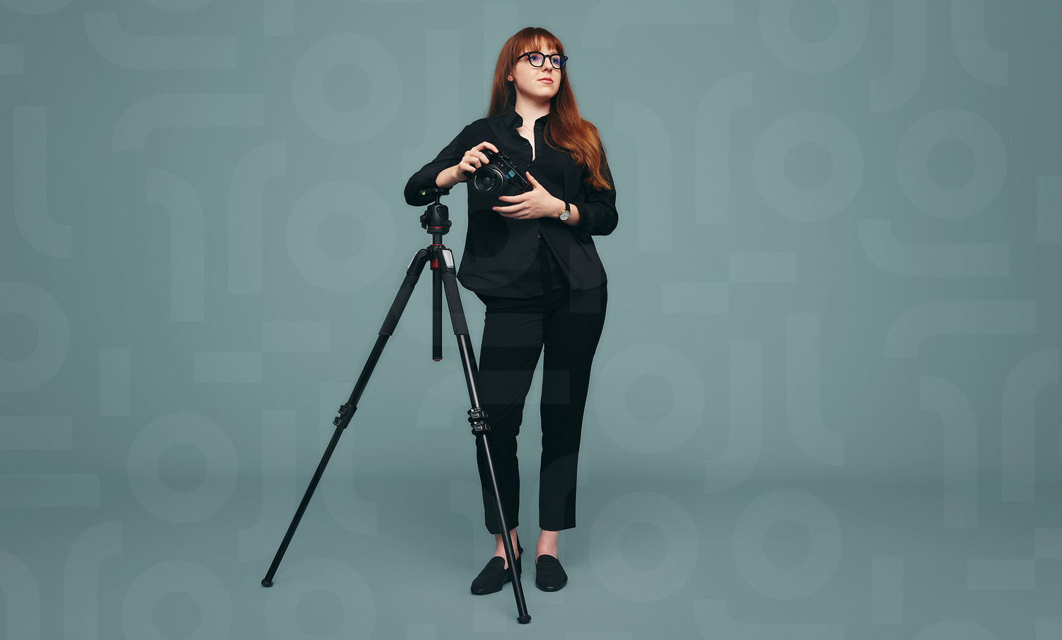 Pensive photographer holding a digital camera while standing next to her tripod. Young professional photographer looking away thoughtfully while standing against a studio background.