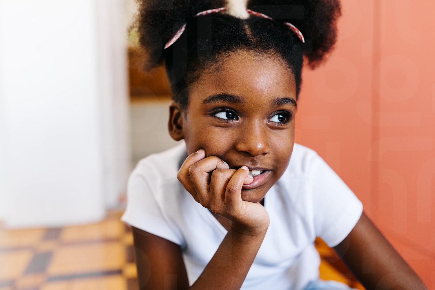 Pensive young girl with afro hair sitting on the floor, looking away and smiling