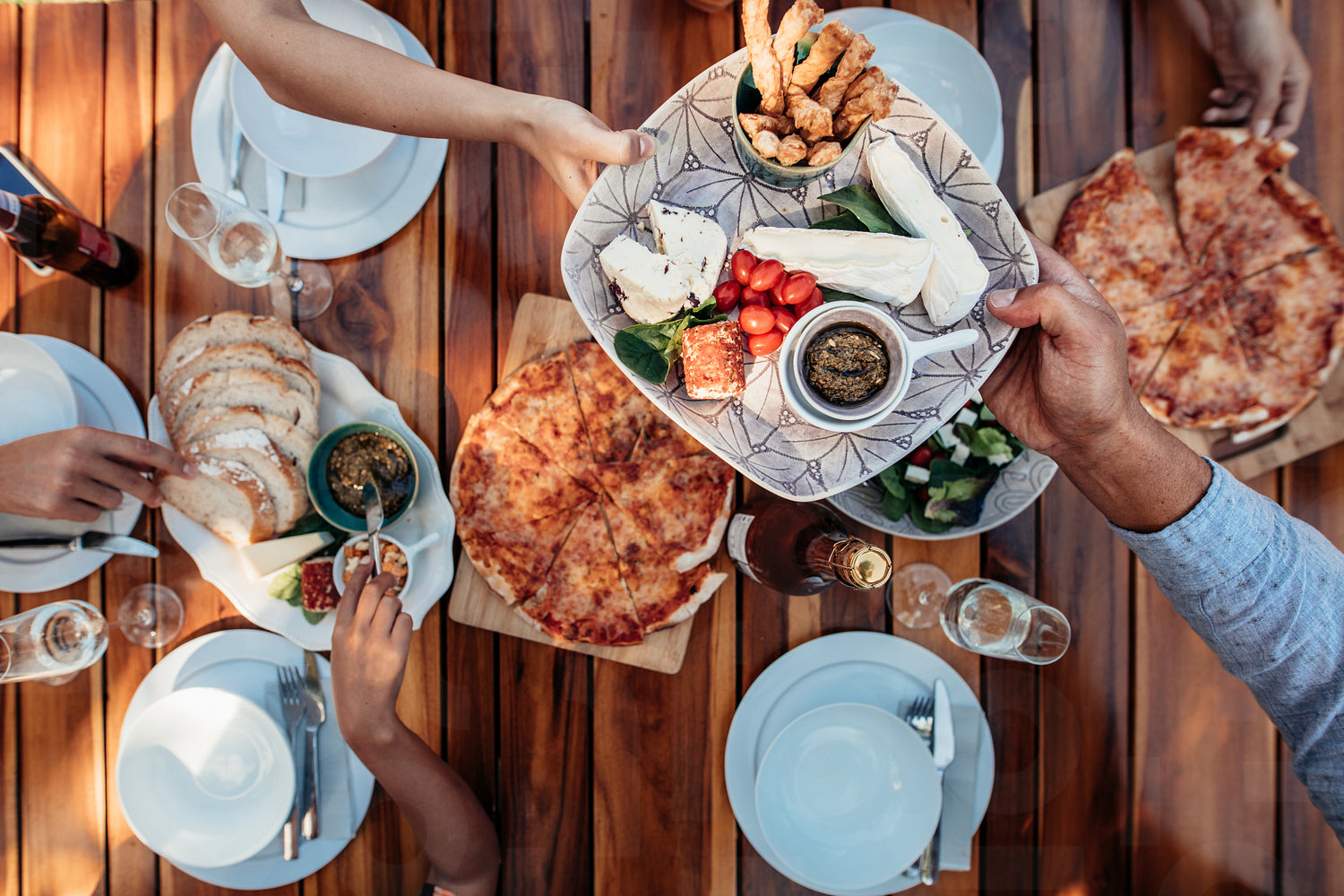 Top view of people eating meal at table served for party. Friends celebrating housewarming party on wooden table. Male hands passing food plate to female guest.