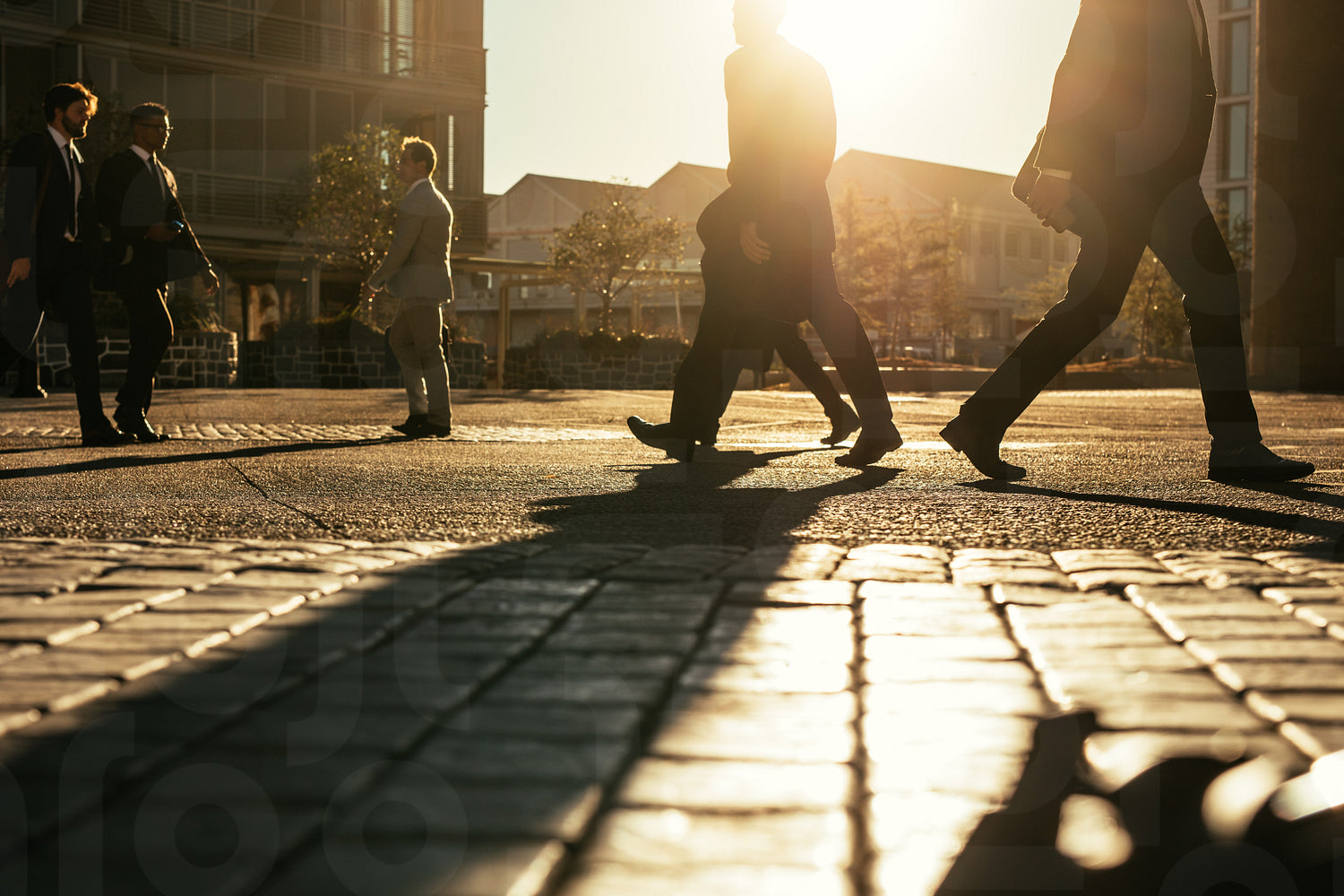 Office going men commuting on a busy city street early in the morning carrying office bags. Businessmen walking on a busy city street rushing to workplace with sun in the background.