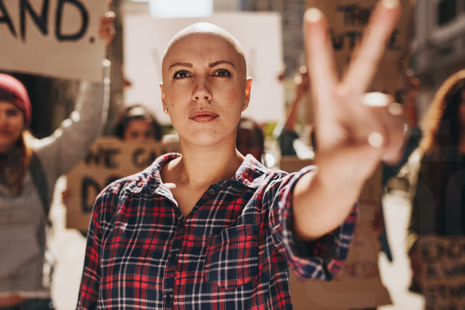 Bald woman protesting outdoors and showing a peace hand sign. Woman with group of people protesting outdoors on city street.