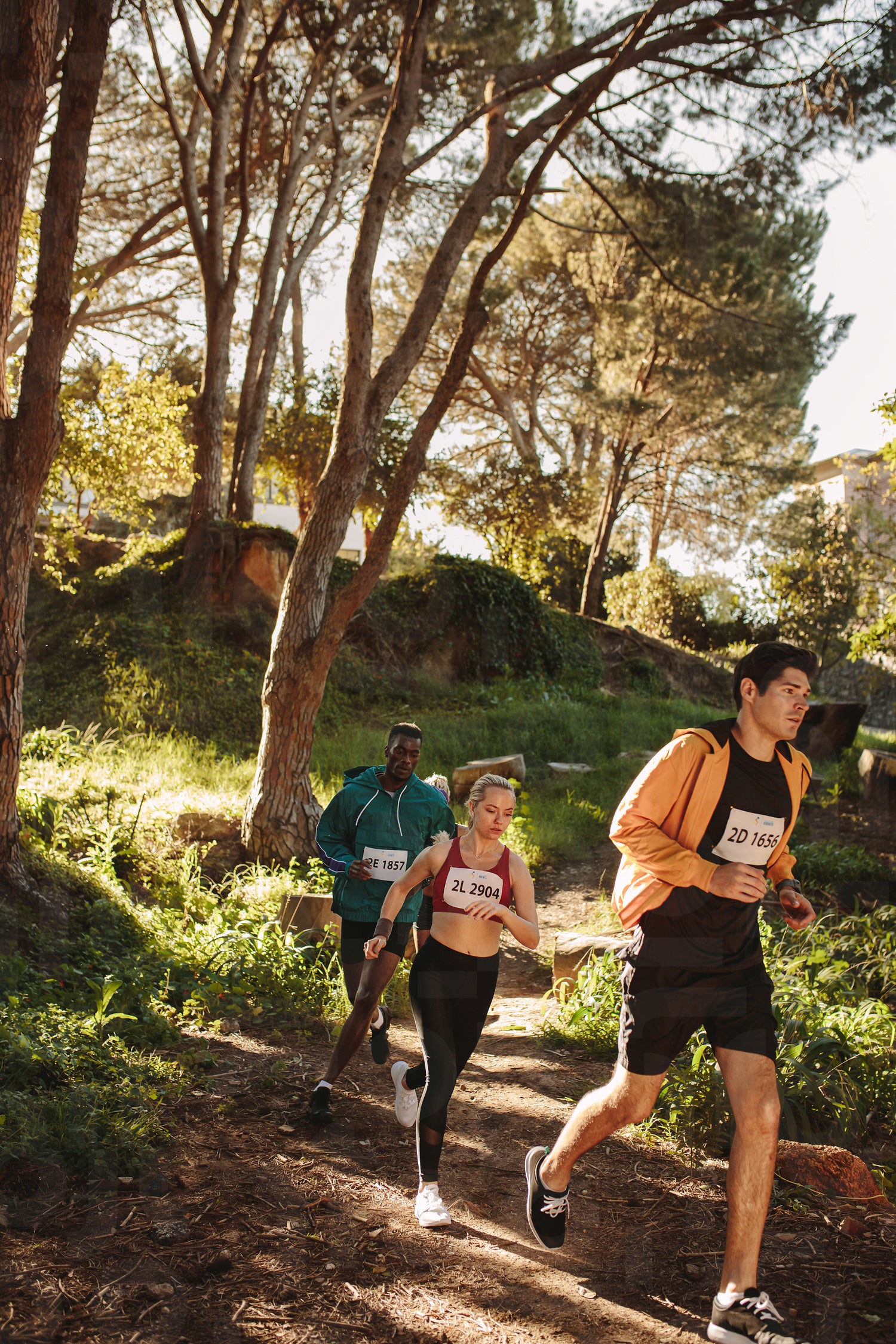 Athletes running down hill on mountain trail. Men and women running a cross country marathon race.