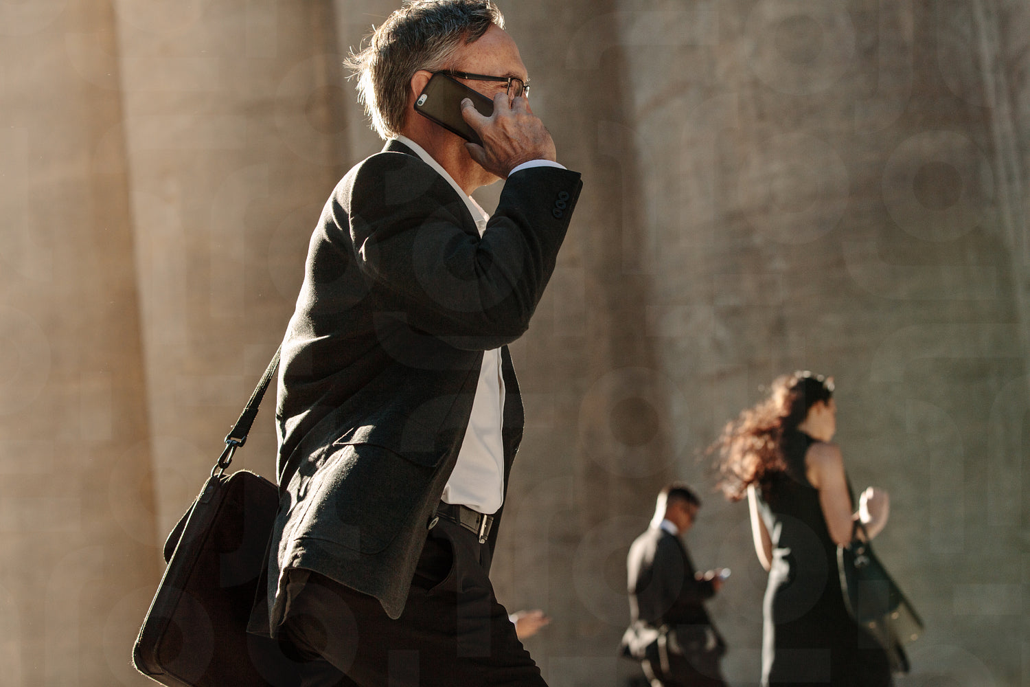 Man in formal clothes talking over mobile phone while commuting to office. Busy office going people using their mobile phones while walking on street.