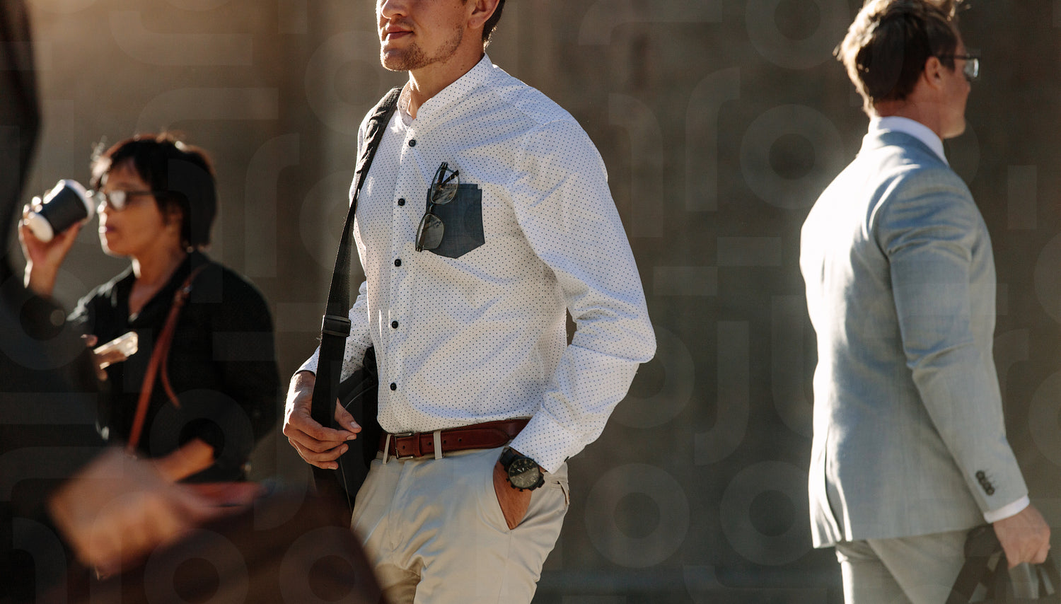 Men and woman commuting to office in the morning carrying office bags. Office going people walking on a busy street with some drinking coffee and using mobile phone.