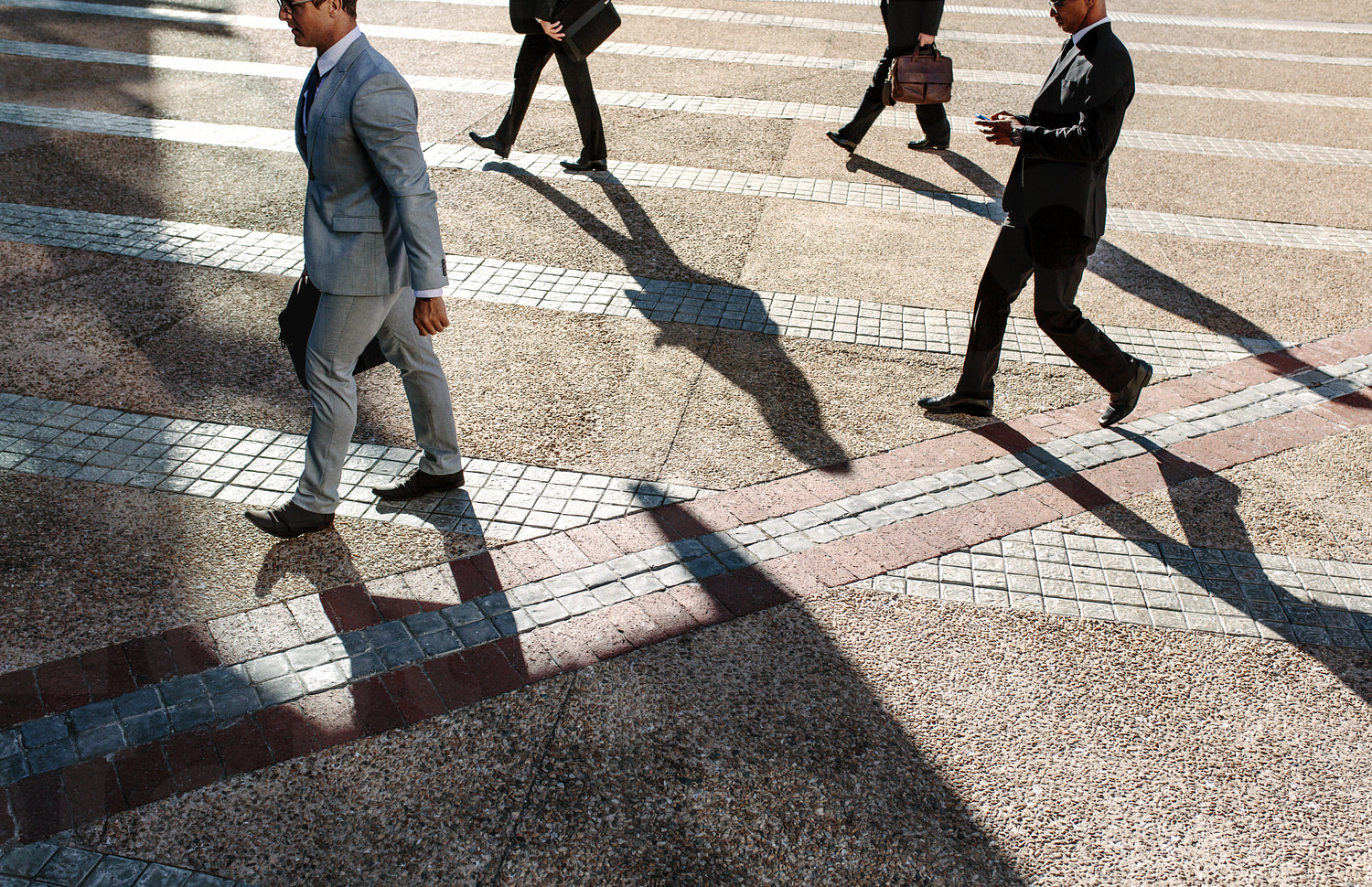 Men commuting to office in the morning carrying office bags. Businessmen in a hurry to reach office walking on city street with some using their mobile phone.
