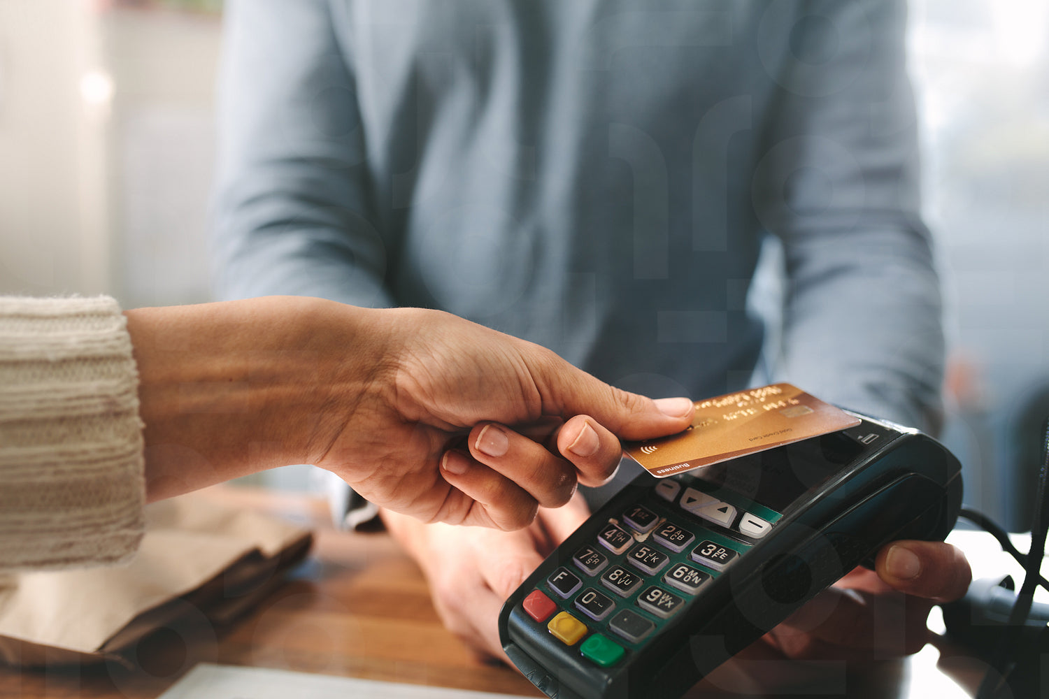 Pharmacist accepting credit card by contactless payment