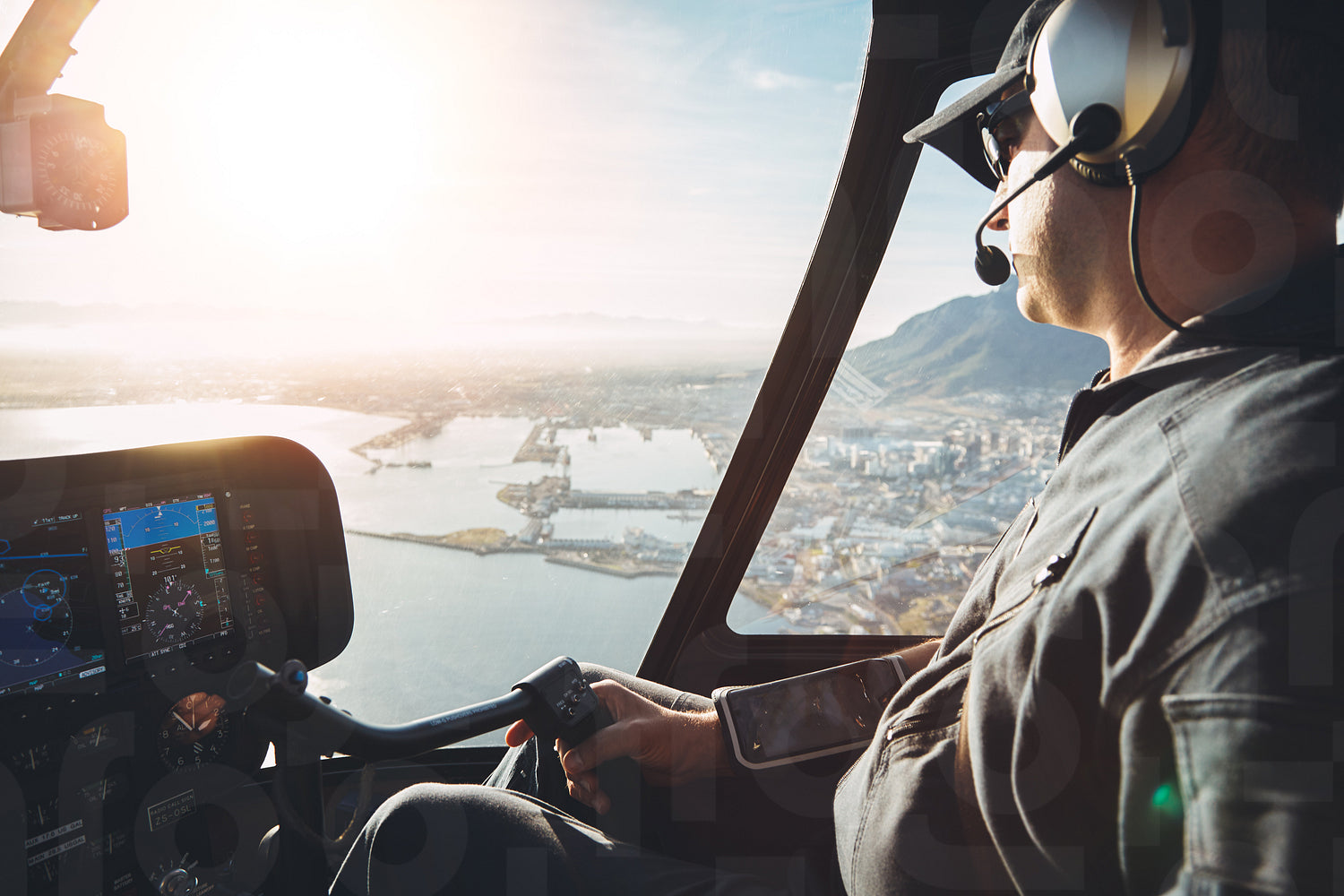 Male pilot in cockpit of a helicopter flying over cape town city on a bright sunny day.