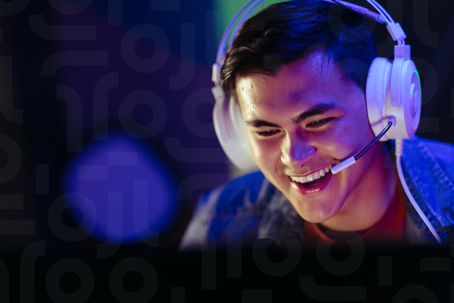 Player smiling at his computer screen, enjoying his experience in an online gaming session. Happy young man sitting on a pc with a headset, streaming a video game on an online platform.