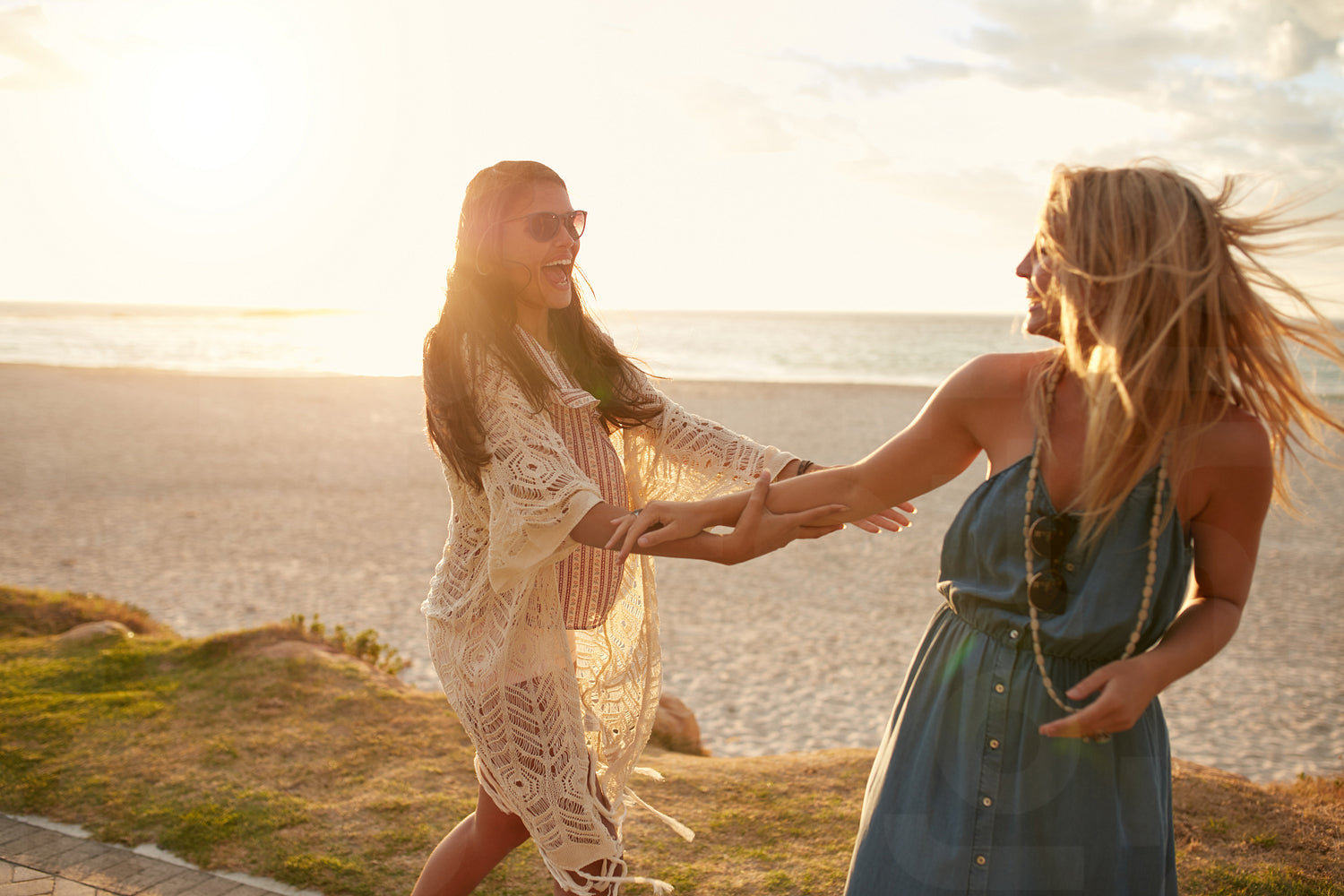 Two young female friends on a sidewalk along the beach playing. Young women having fun on the sea shore, enjoying summer day.
