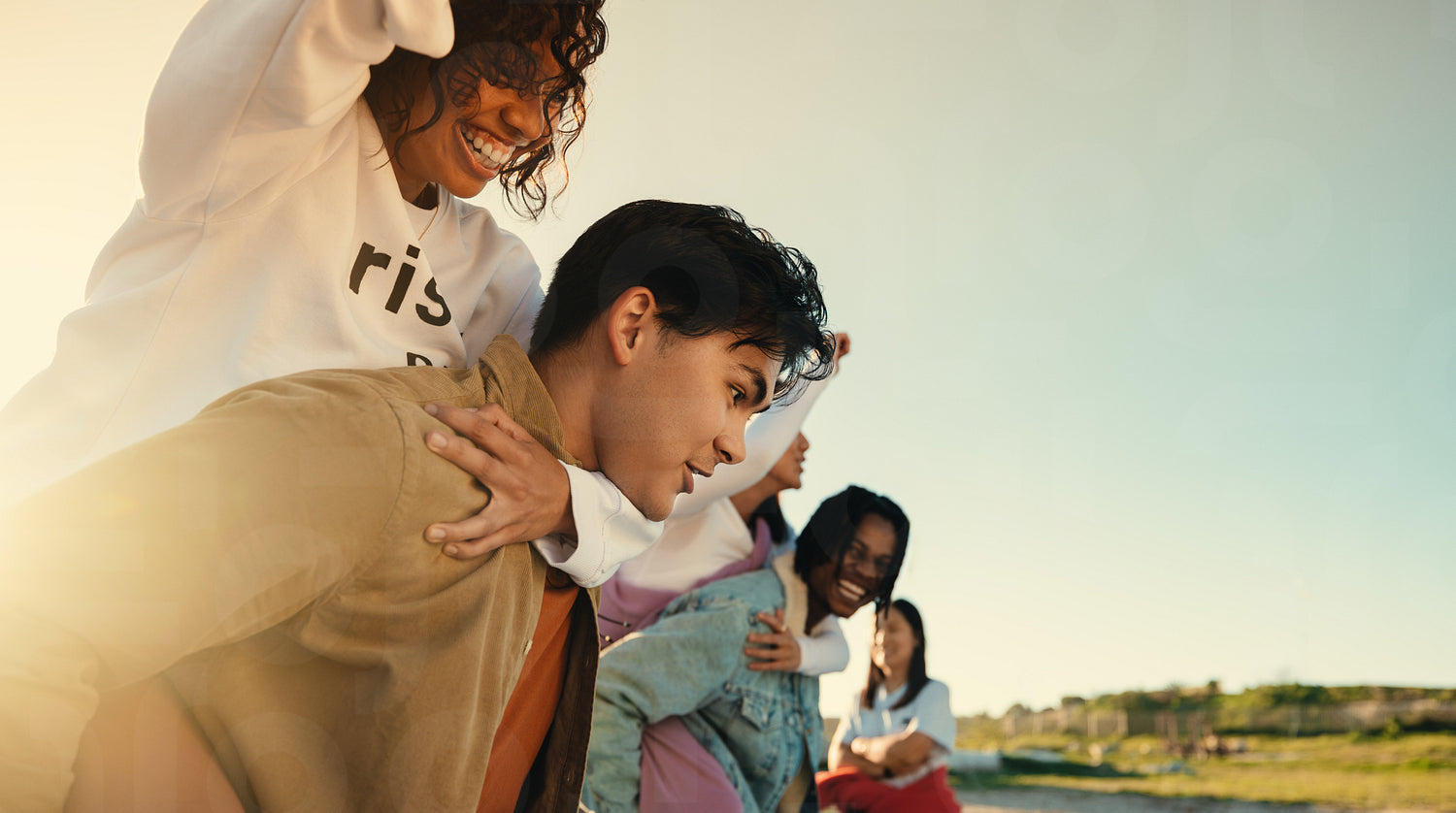 Playful friends enjoying piggyback rides on a sunny summer day by the beach