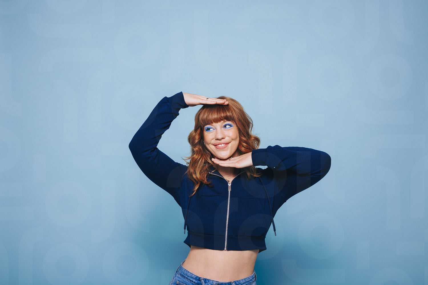 Playful young woman framing her face with her hands in a studio. Woman with ginger hair having fun while standing against a blue background.