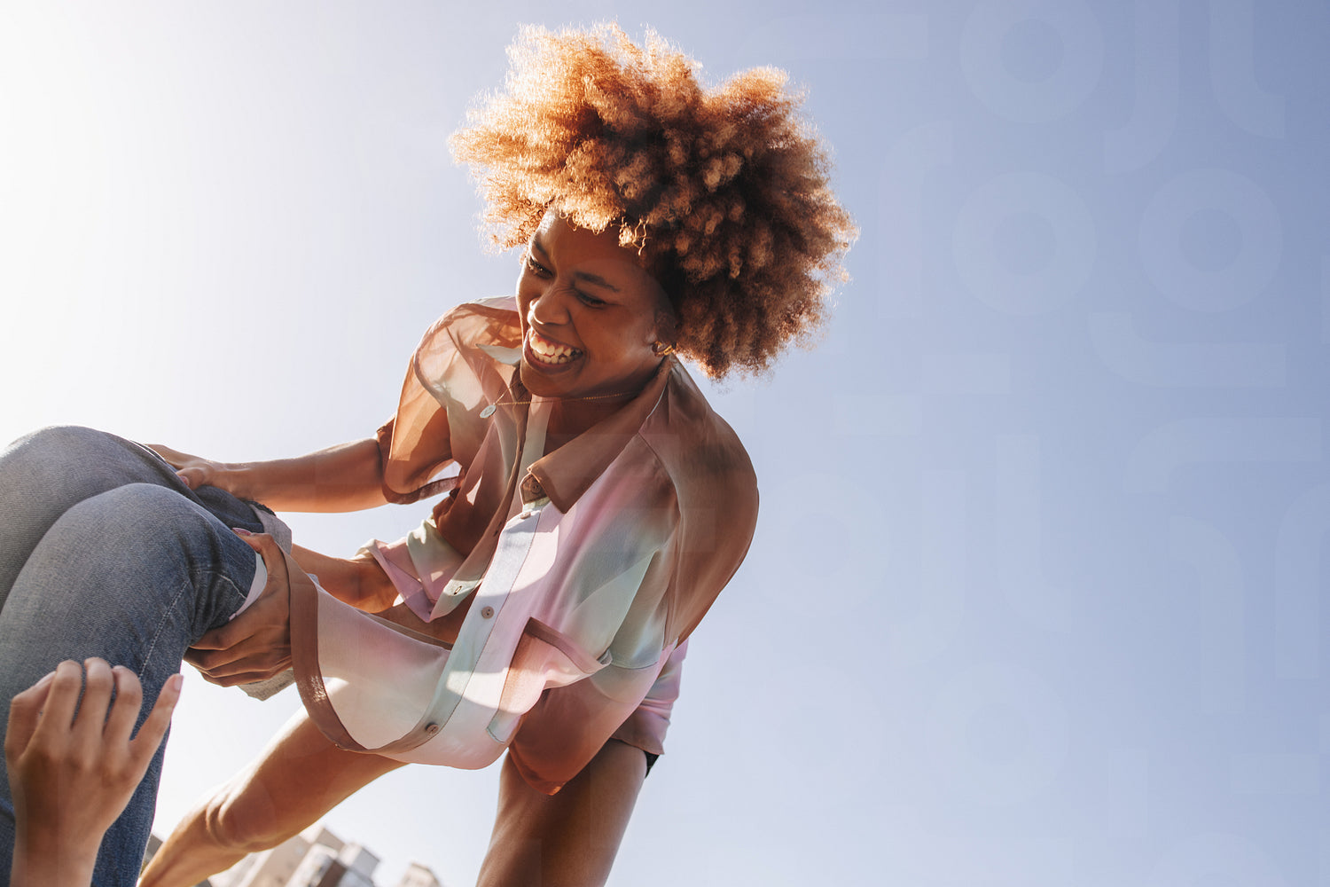 Playful young woman with afro smiling in the sunshine having fun outdoors