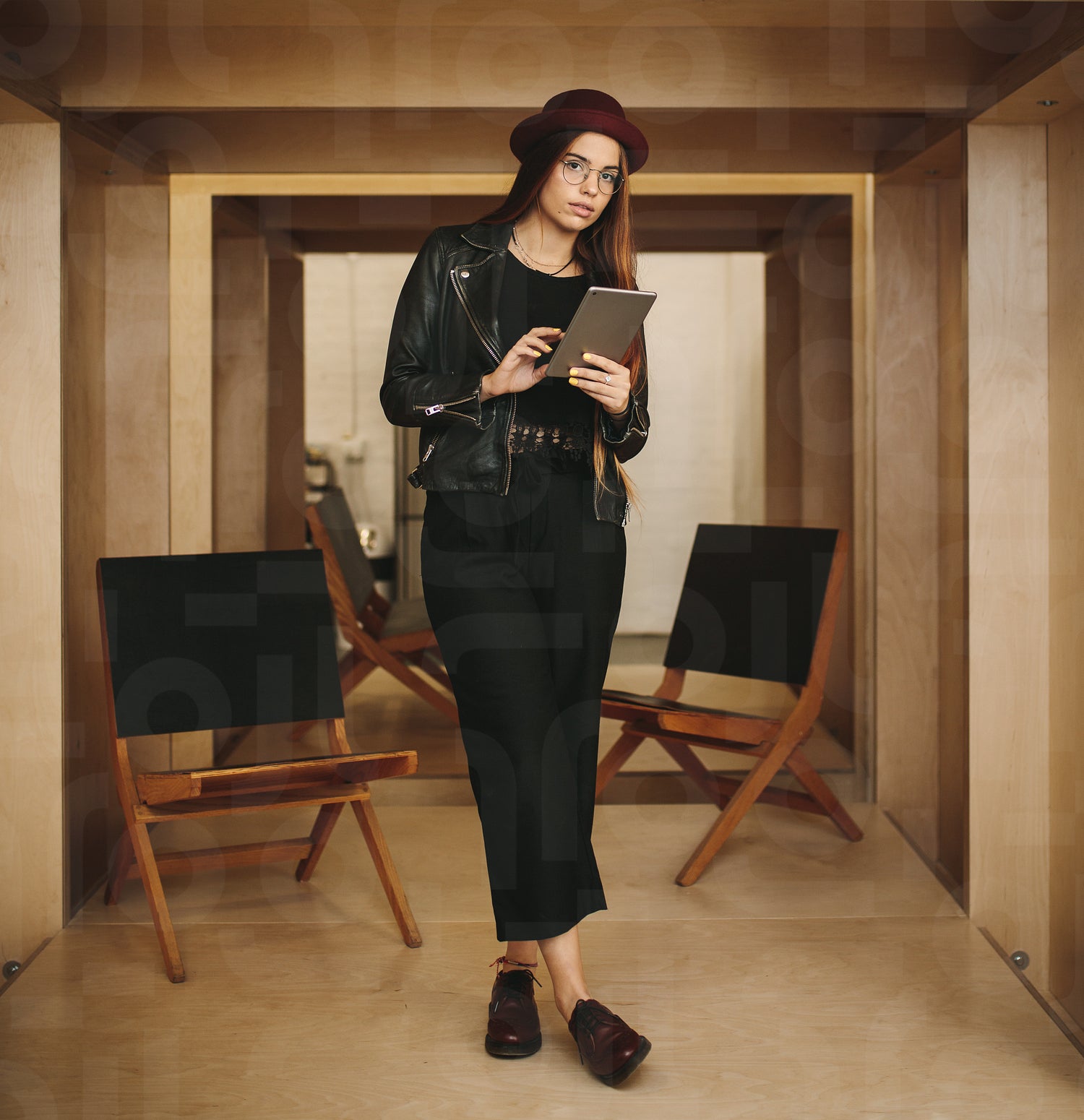 Woman entrepreneur holding digital tablet standing inside an enclosure at office. Creative businesswoman in hat and eyeglasses standing in office using a tablet pc.