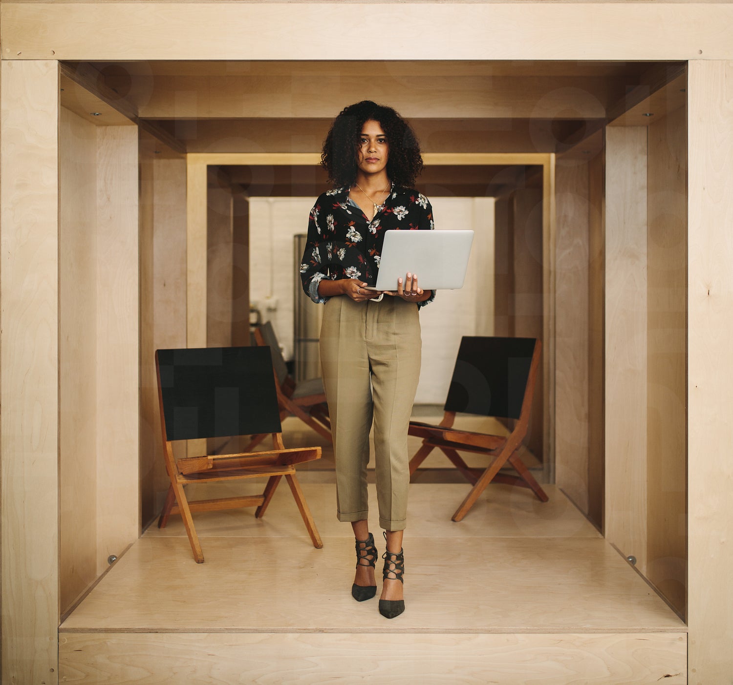 Woman entrepreneur holding laptop standing inside an enclosure at office. Businesswoman standing with an open laptop.