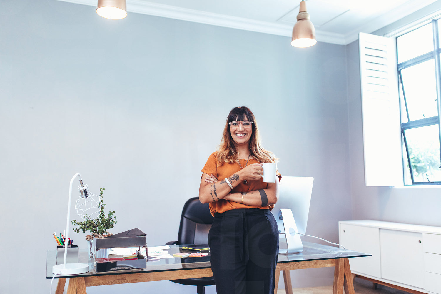 Smiling woman entrepreneur standing near her table in office holding a coffee cup. Cheerful businesswoman in her office enjoying a cup of coffee.