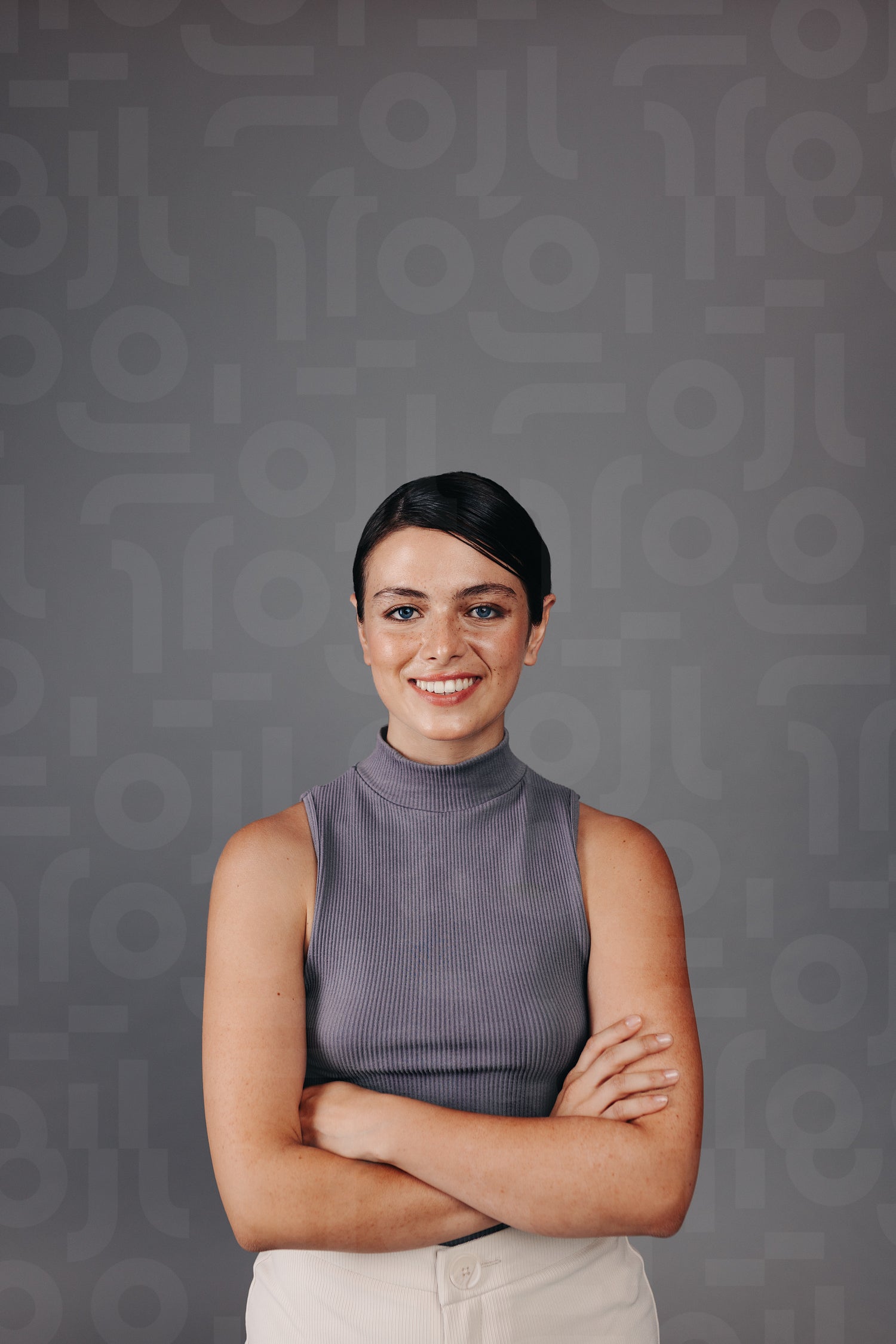 Portrait of a cheerful young woman smiling at the camera while standing with her arms crossed. Young woman feeling happy while standing against a grey background.