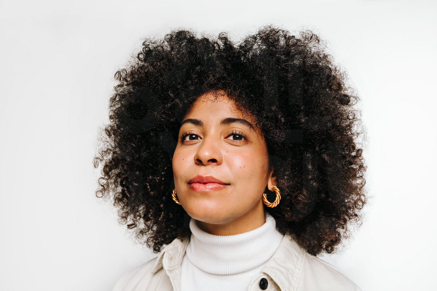 Portrait of a confident woman with curly hair looking at the camera while standing against a white background. Gorgeous young woman of colour wearing her natural hair with pride.